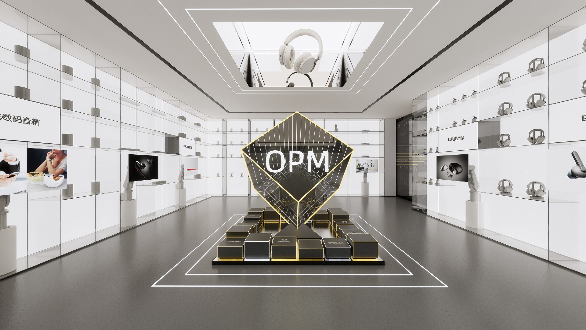 三诺声智联作为三诺旗下关于“声音+”生态链业务板块的子公司,智慧声谷展厅不仅需要展示技术能力,更需要展示“三诺灯塔工厂”的智能制造的能力。我们基于对品牌和产品的深度研究,以“聚谷传声,声联万物”为策展主题,通过“聚”场、“声”景、“智”谷、“链”态、“云”图的故事线来多元聚合,通过生态化、可视化的空间设计逻辑来赋能企业未来+。
