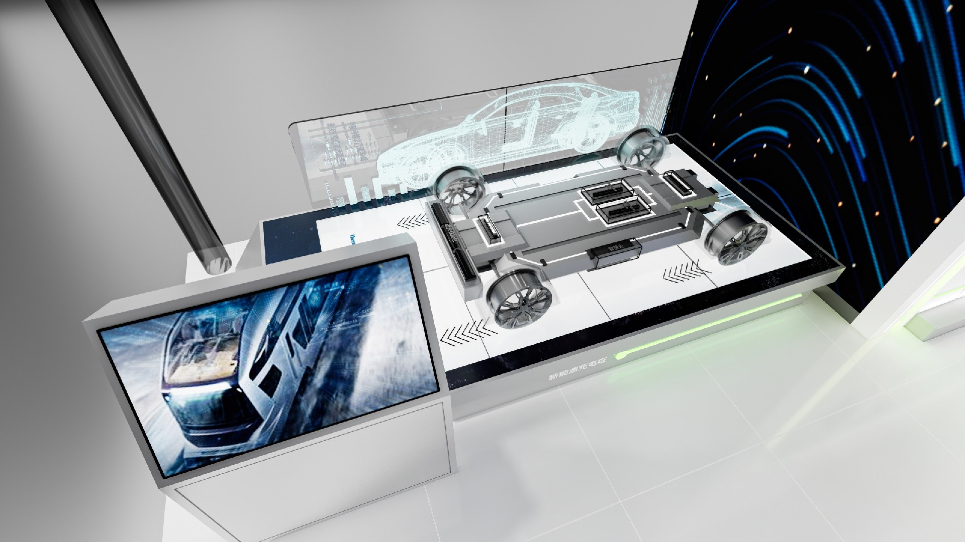 2024年建博会,格外空间联手会通打造了会通展台,会通希望以创新为先引领行业发展,用新材料塑造绿色低碳的未来生活,为此,我们以绿色作为点缀主色调,白色为背景,搭配科技蓝为辅助色,结合循环曲线的空间结构,使用白色或绿色的磨砂饰面板、树脂玻搭配亚光灰、白漆墙面,以细腻的材质肌理碰撞表达工艺美学