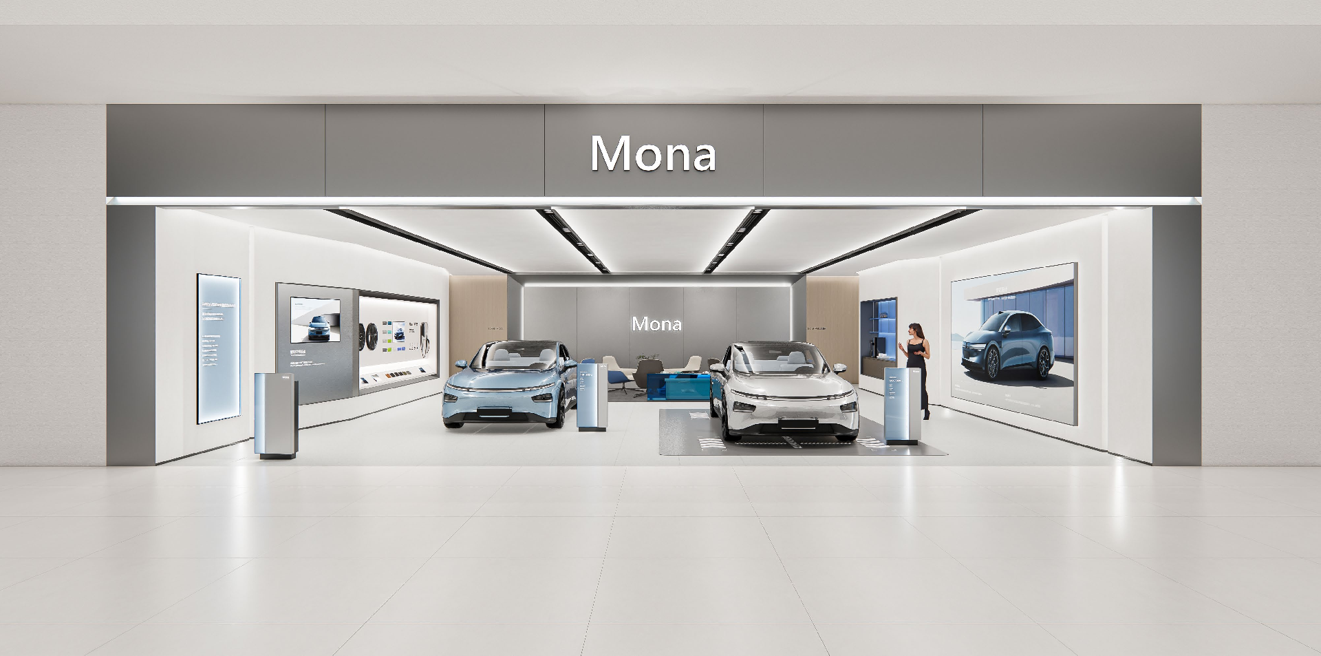 小鹏Mona用户以“热爱科技”的年轻时尚群体为主,方世设计基于用户审美与品牌调性,构建Mona高辨识度的终端形象视觉符号。空间通过光晕表达品牌色彩,呈现能量散发的状态,表达科技智能感的同时体现年轻氛围。简约利落,明亮的空间处理,金属材质加强科技感。色彩通过70%有温度的白+20%有质感的灰+10%品牌色运用,呈现年轻时尚的科技智能。