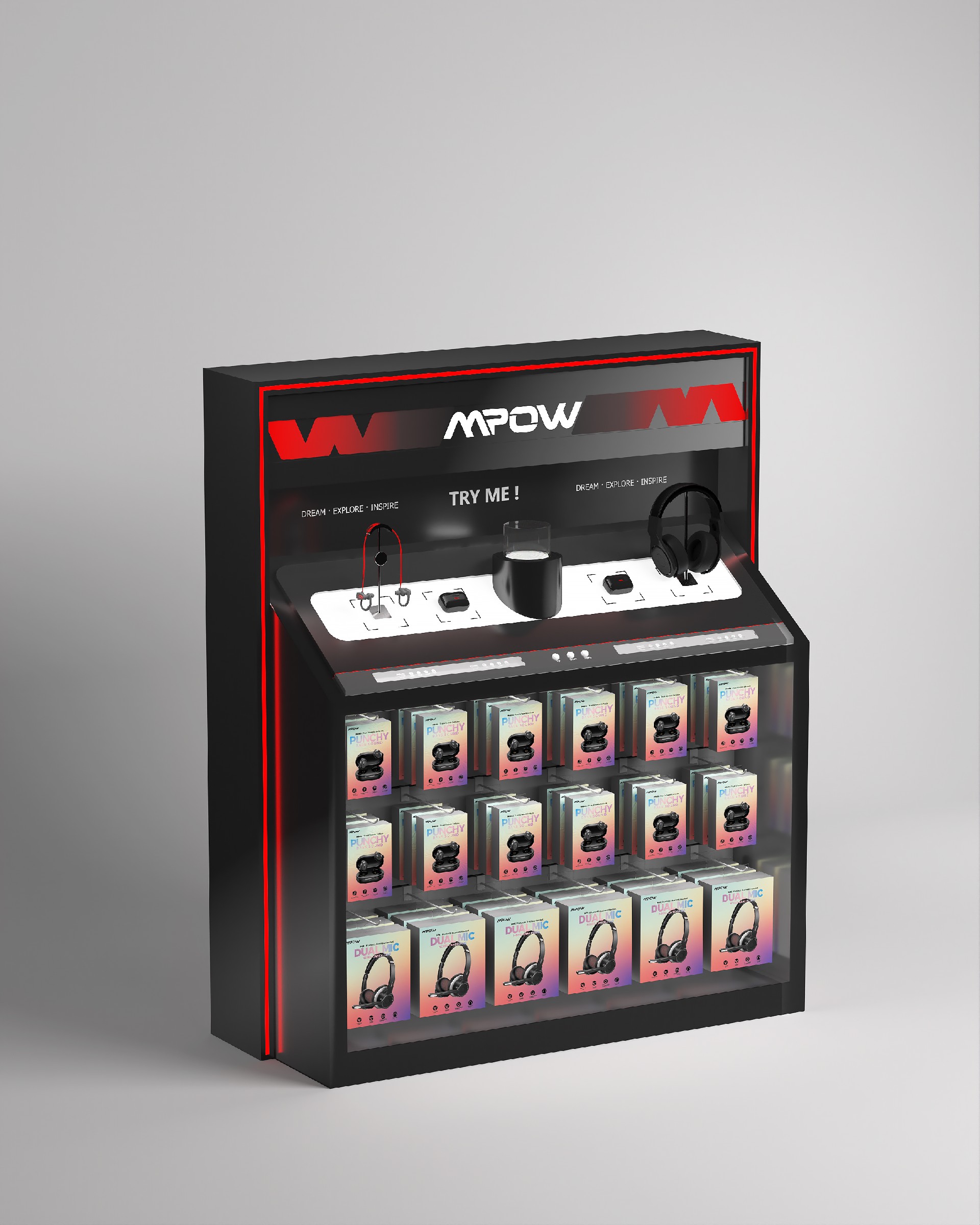 方世设计 基于MPOW零售终端旗舰店的形象设计,延展到展示道具系统中,以达到更好的信息传达与清晰的产品展示,更重点展示主推产品。 运用卖点辅助销售物料(POSM) 用于执行广告活动、展览和演示,开发了一整套的终端生动化物料,让耳机卖点不再高冷、晦涩、难懂,让消费者在最短的时间get到重点。