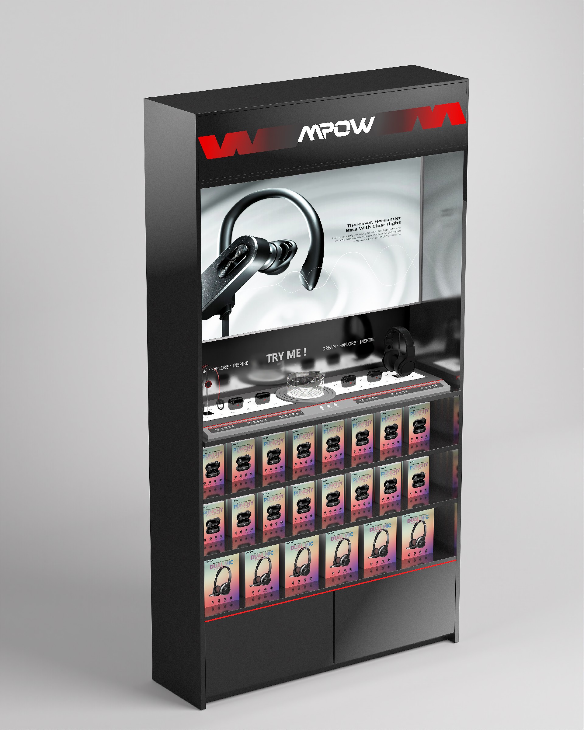 方世设计 基于MPOW零售终端旗舰店的形象设计,延展到展示道具系统中,以达到更好的信息传达与清晰的产品展示,更重点展示主推产品。 运用卖点辅助销售物料(POSM) 用于执行广告活动、展览和演示,开发了一整套的终端生动化物料,让耳机卖点不再高冷、晦涩、难懂,让消费者在最短的时间get到重点。