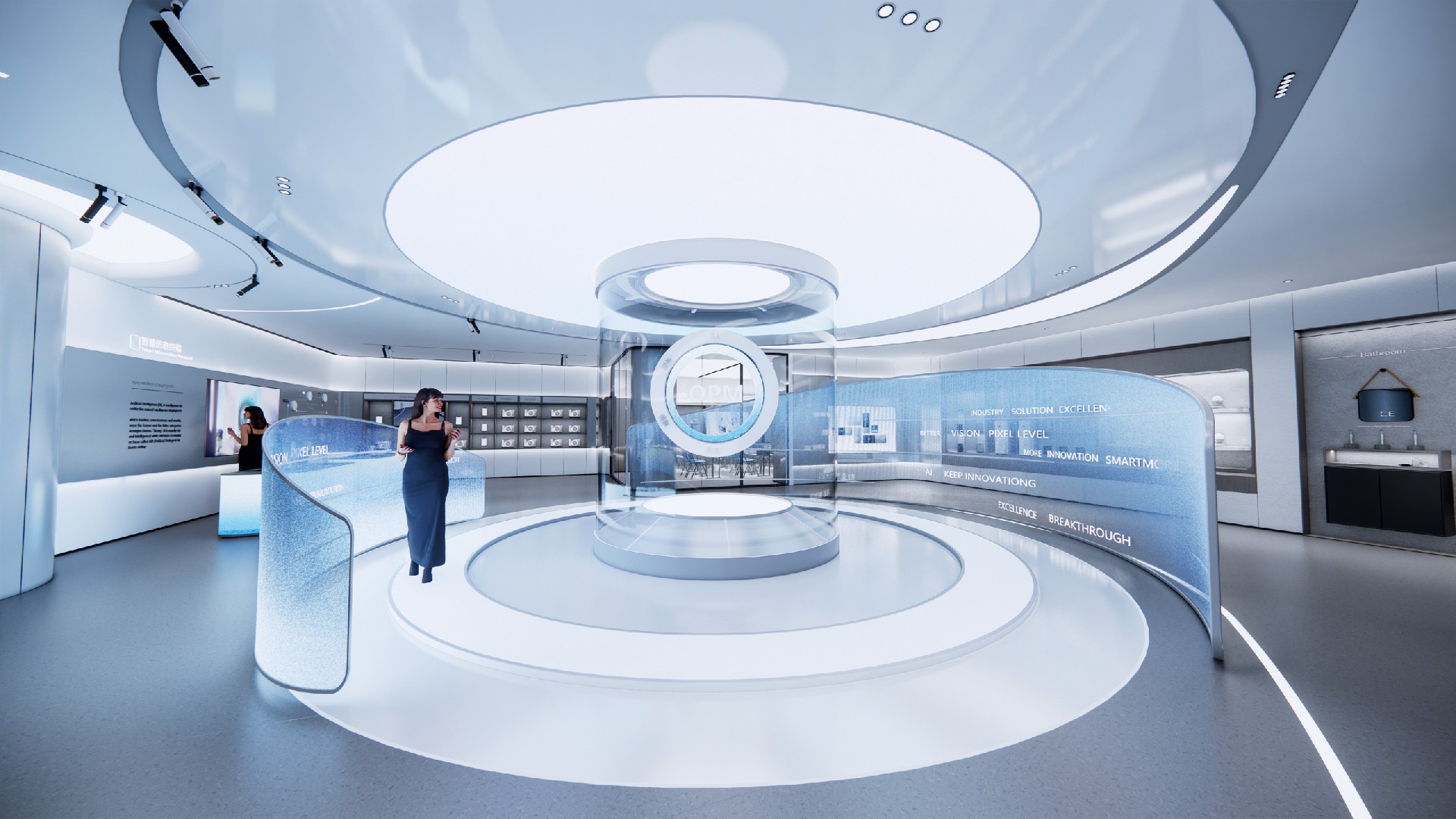 我们提取三诺品牌理念,整体空间采用环形流线布局将视觉中心聚焦到“时代智造”、“产业赋能”、“未来社区”三大核心点,提升展示空间记忆点同时提高展示内容的区域感与空间层次,参观动线更加流畅,使来访者仿佛行走在时代与未来科技创新之旅。