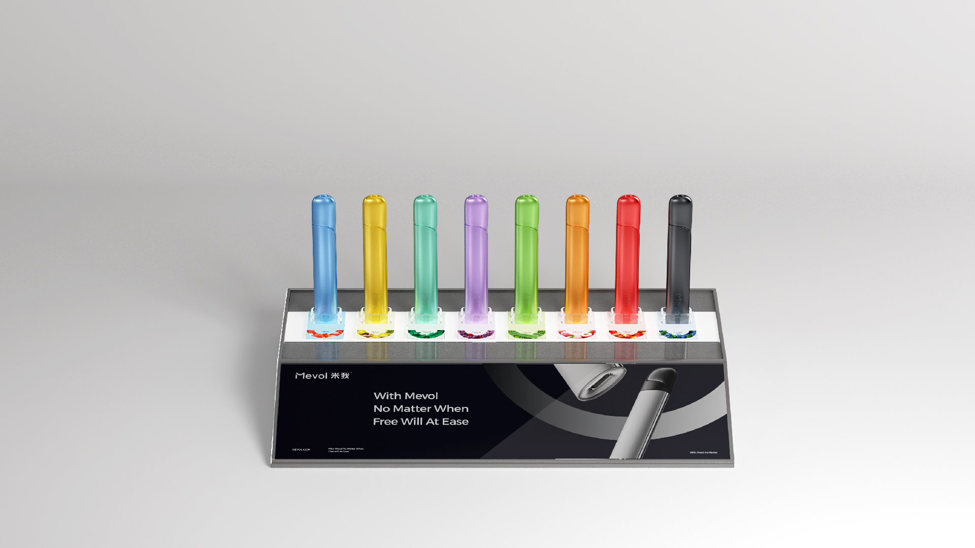 方世设计与「Mevol米我」携手合作,突破国内电子烟的商业瓶颈,探索创新零售模式,重新塑造「Mevol米我」展示道具。因为这次产品主打“自然多口味”特色,呼应“引领更健康的生活”的品牌使命。因此在道具展示上,通过强化“糖果”粒子视觉,表达多重口味的选择性,鲜艳有食欲的色彩搭配高级灰,提升品牌感知价值,更能吸引消费者的注意力。